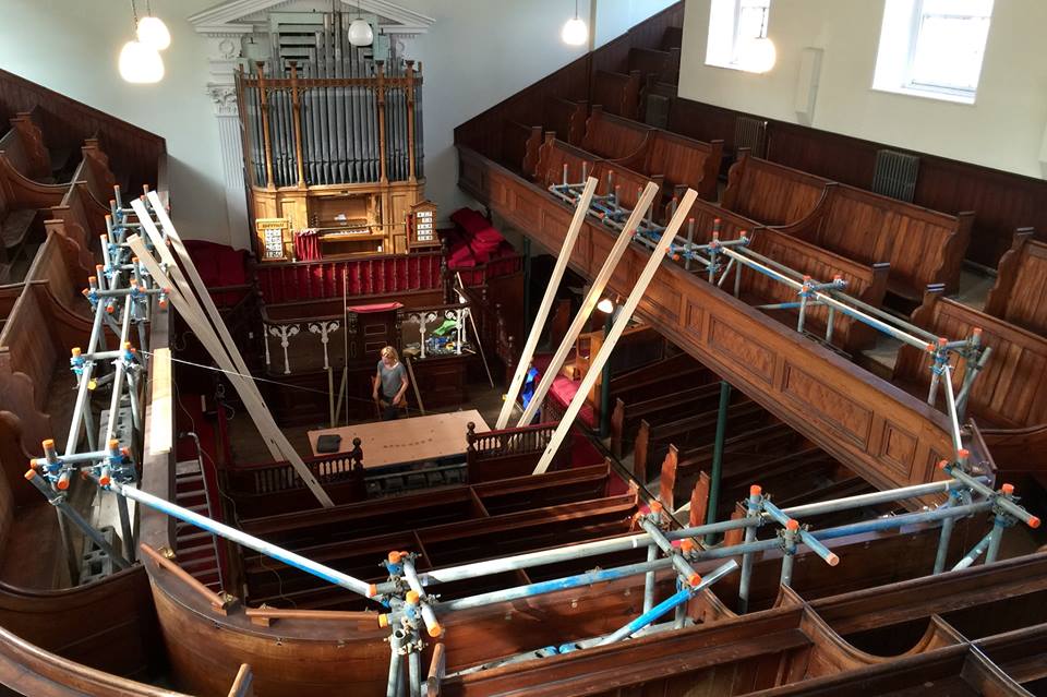 A very large scale experimental instrument is being built in the Tabernacl Baptist Church at the top end of the high street in Llandudno. The idea is Jenny Hall's (http://craftedspace.co.uk/, https://www.facebook.com/craftedspace.co.uk/posts/1272702682742077) who hails from Machynlleth and is constructing the piece with the aid of Roger Hughes and Ed Wright.