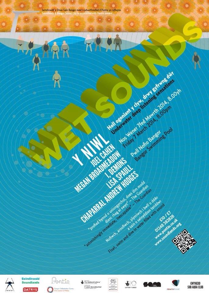 In Bangor Swimming Pool on Friday 7 March 2014, people will have the opportunity to attend unique alternative music event Wet Sounds. The audience will float in the water rather than sit in theatre seats, while listening to performances by well travelled surf rockers Y Niwl, Joel Cahen and Chaparral Andrew Hodges, through special underwater speakers.